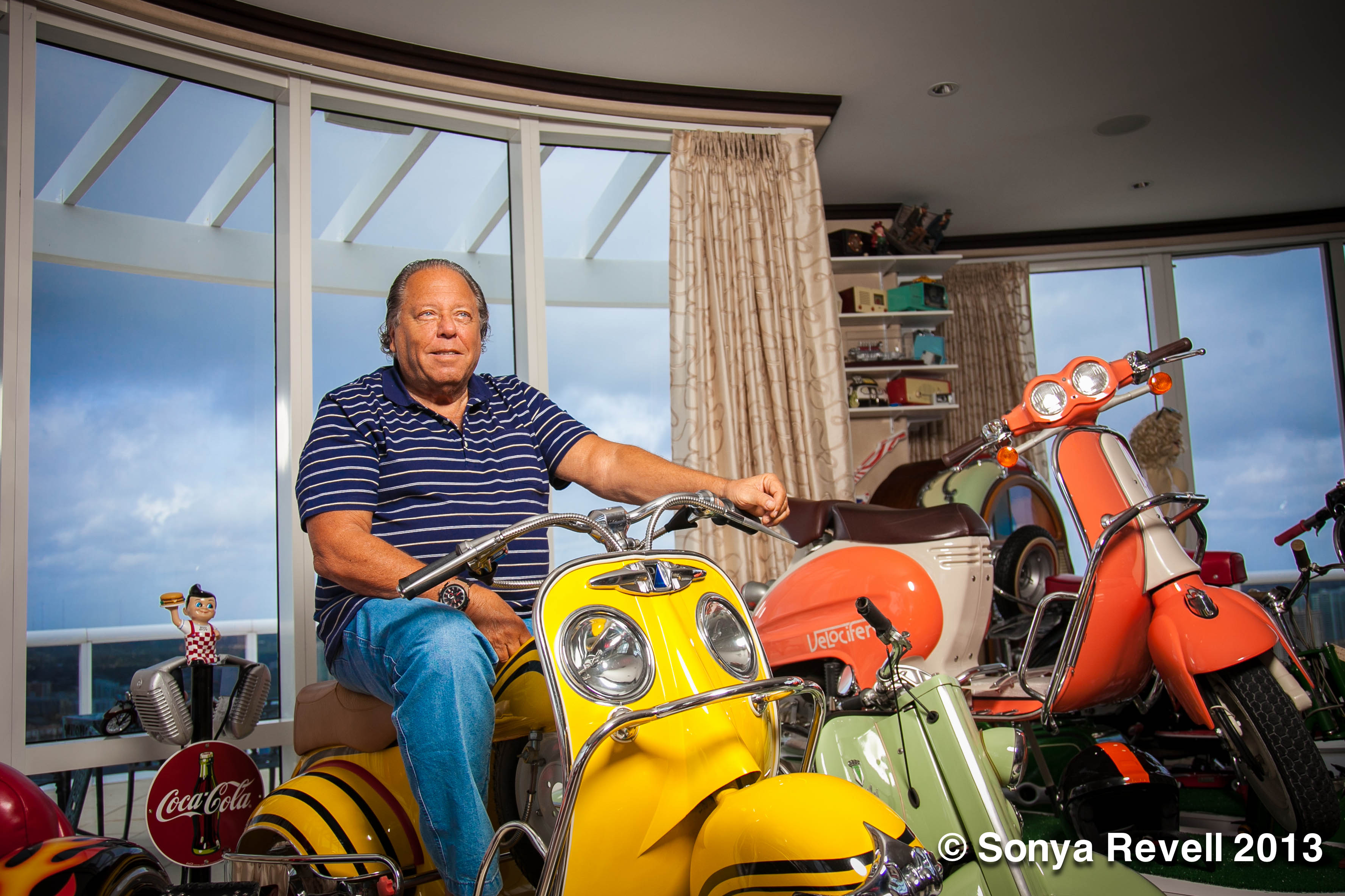 The next morning, when I met Mr. Dezer at his home in one of the Trump Towers, (a high-rise he helped develop and owns, I believe) he led me to his (self-proclaimed) man area, over-looking 360 degrees of North Miami Beach (he can see both downtown Miami and Fort Lauderdale) where he houses a small collection of Vespa scooters. This is where we began our shoot.